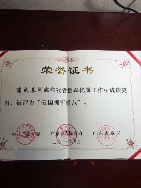 凯仕乐集团董事长潘成森先生被评为“爱国拥军模范”。