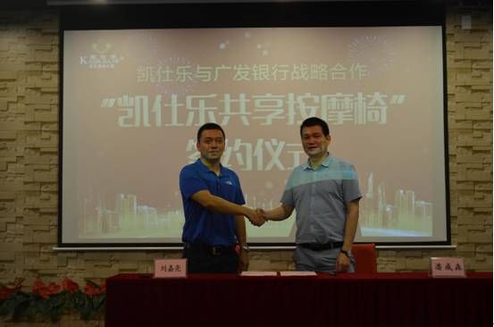 9月1日,凯仕乐在公司总部与广发银行佛山分行签署战略合作协议,确立了通过全国拓展“凯仕乐共享按摩椅”,为项目推广融资服务等达成一系列全方位的战略合作。广发银行佛山分行信用卡部副总经理刘嘉亮,公司领导潘成森董事长、邓乐平副总经理出席签约仪式。